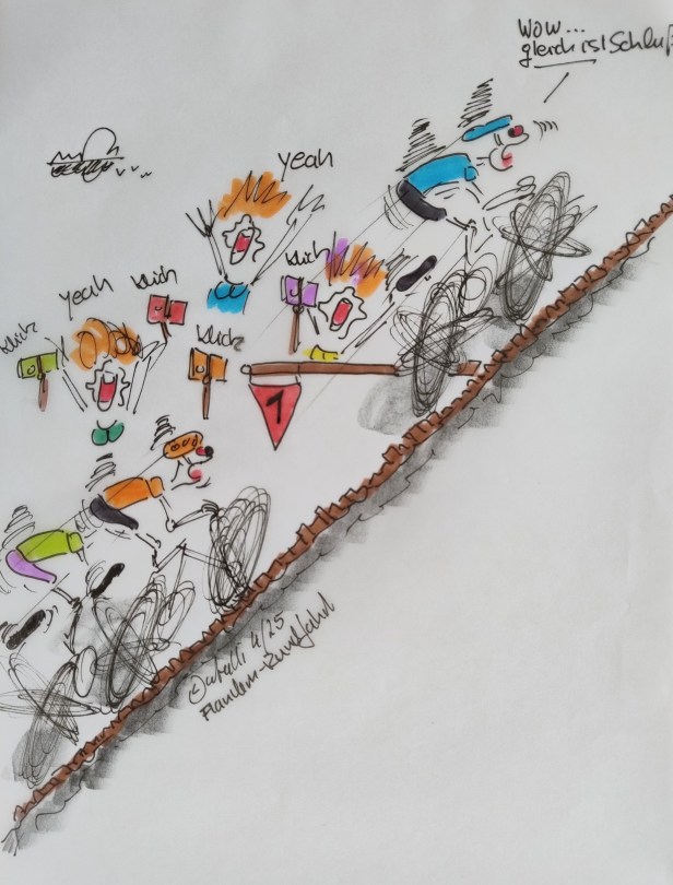 16,7 km vor dem Ziel trifft die Führungsgruppe zum ersten und einzigen Mal auf den Oude Kwaremont, bevor sie den Paterberg bezwingen muss. Dann sind es noch 13,2 km bis zum Ziel, wo der Sieger der Flandern-Rundfahrt 2025 ermittelt wird.