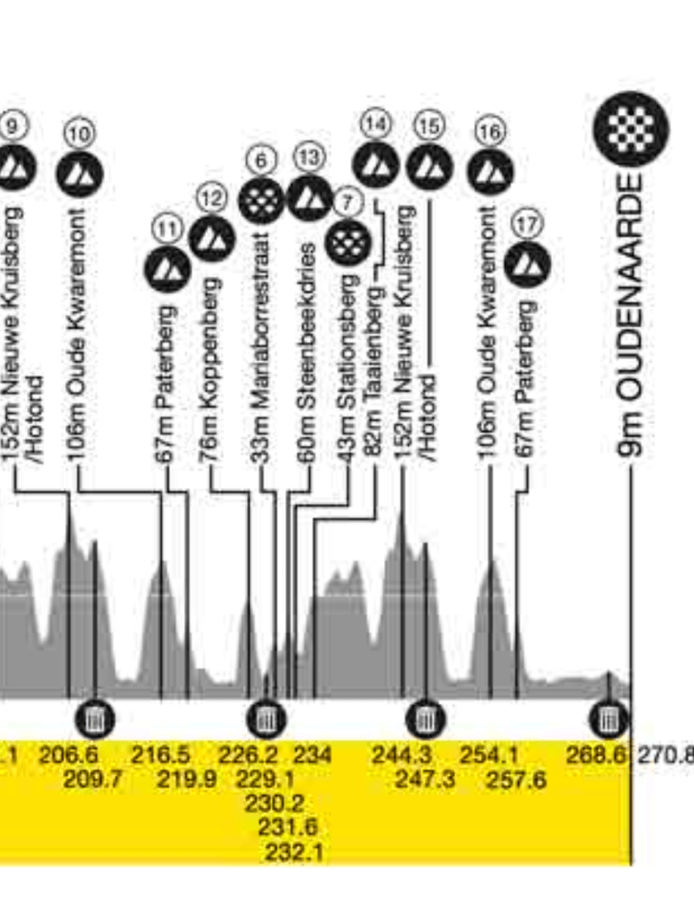 Getauscht wurde der 3. Anstiege – Eikenberg anstatt Kapelleberg – und gestrichen der bisher 5. Anstieg an der Marlborougstraat. Die letzten 12 Hellingen blieben hingegen unangetastet. Innerhalb der letzten 60 Kilometer gibt es das erweiterte Finale mit Oude Kwaremont, Paterberg, Koppenberg, Steenbeekdries, Taaienberg, Oude Kruisberg und noch einmal Oude Kwaremont und Paterberg. Von dessen Gipfel sind es unverändert 13,2 Kilometer bis ins Ziel nach Oudenaarde.