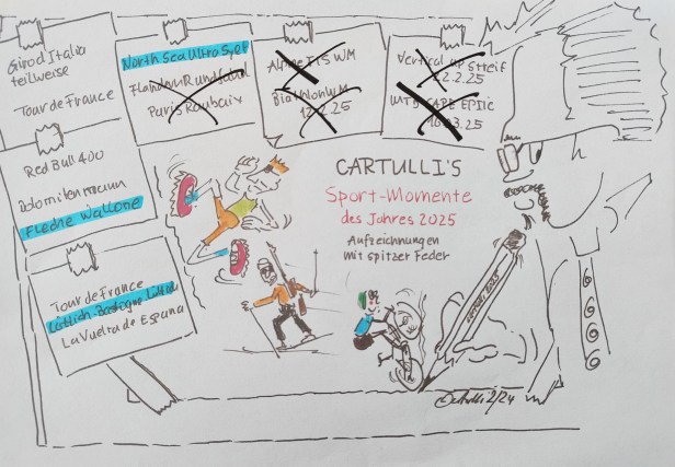 cartulli’s Sport-Momente des Jahres 2025. Es geht weiter: am 23.04.2025 mit einem Cartoon zum Fleche Wallone, und dann am 27.04.2025 mit dem Klassiker Lüttich-Bastone-Lüttich (Frauen und Männer), sowie vor dem Giro d’italia, mir Cartoons zum Trail-Run North Sea Ulta Sylt am 10.05 – lasst euch überraschen.