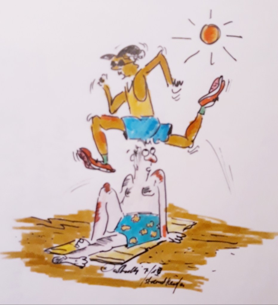 Urlaub am Meer macht er nur seinem Partner zuliebe. Viel lieber hätte er einen Berglauf auf den Kilimandscharo oder einen Marathon über die Chinesische Mauer gebucht. Seinen Bewegungsdrang muss er deshalb am Strand ausleben und da sind ihm die Menschen am Strand eigentlich nur im Wege. So springt und hüpft er über die Badegäste, das man glauben könnte er trainiert für einen 3000m Hindernislauf. Und so läuft und springt er und läuft und läuft…vielleicht sind Sie ihm ja schon einmal begegnet. Wenn nicht, halten Sie einmal nach ihm Ausschau, vielleicht ist er gerade dann am Strand.