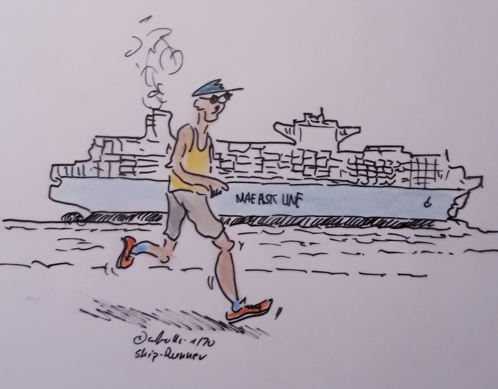 Hier gibt es jetzt eine neue Spezies den „Ship-Runner“. Er ist dann Vorort wenn es darum geht mit einem „Riesen der Meere“ um die Wette zu laufen – sich in Kraft und Schnelligkeit mit ihm zu messen. Drei Kilometer ist die Strecke – von der Alten Liebe in Cuxhaven zur Kugelbake oder zurück.