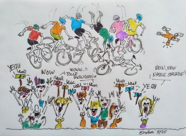 Giro d’italia 2025 – Massensturz und Neutralisations-Chaos im Regen vor Neapel: Jai Hindley und Juri Hollmann raus. Rund 70 Kilometer vor dem Ziel der 6. Etappe des Giro d’Italia 2025 kommt es auf nasser Straße zum Massensturz und das Rennen muss unterbrochen werden. Während Jai Hindley und Juri Hollmann die Rundfahrt aufgeben mussten, hielt die Jury das Peloton an und schickt es dann nach einer Unterbrechung mit dem ursprünglichen Abstand zwischen Spitzengruppe und Hauptfeld wieder auf den Weg in Richtung Neapel.