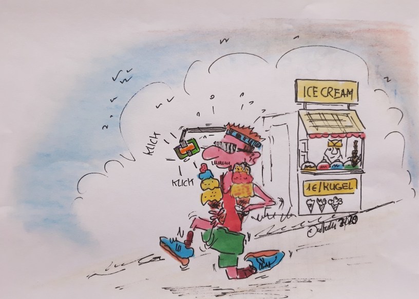 Woww, es ist schon 28 Grad. Jetzt kommt meine pfiffige Idee bei GROSSER Hitze zum Einsatz – zwei Eis essen, Laufen und noch ein Selfie machen … läuft!! (Zeichnung: cartulli CCC Cuxhaven-Cartoon-Center – Die Storyfactory)