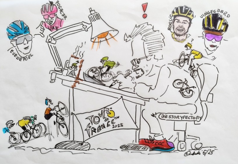 Tour de France 2025: Die Storyfactory und das Cuxhaven-Cartoon-Center werden auch dieses Jahr wieder die Tour de France und die Tour der Frauen, mit passenden Karikaturen begleiten. Es gibt eine passende Karikatur zur jeweiligen Etappe, sowie Hinweise zum Etappen-Verlauf. Morgen geht es los.
