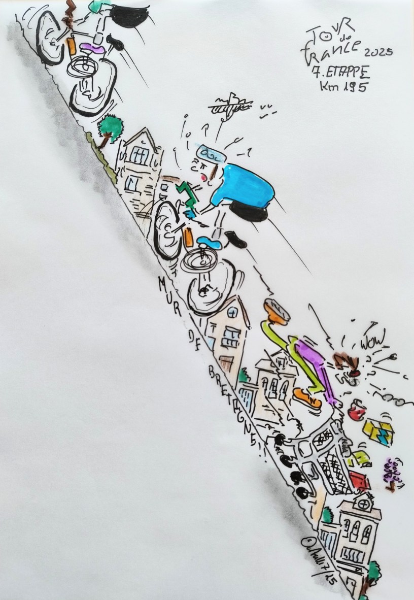 Es geht in die Bretagne! Und wie schon am Vortag steht eine lange und anspruchsvolle Etappe auf dem Programm, die enorm an den Kräften der Profis zehren wird. Relativ zu Beginn geht’s durch Yffiniac, dem Heimatdorf von Bernard Hinault. Die 7. Etappe führt zur Mûr de Bretagne. Allein der Name „Mûr de Bretagne“ ist ja schon ikonisch. Und für die Fans noch einmal in aller Deutlichkeit: Mûr wird übersetzt mit „Mauer“ – und so steil und schwer ist sie auch.Es is