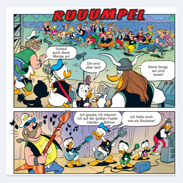 Worum geht es: lauter, lustiger, legendärer – das ist das Motto der Sonderausgabe von Walt Disney Lustiges Taschenbuchs (LTB) „LTB Heavy Metal“. Ab dem 15. Juli 2025 können sich Heavy Metal-Fans auf sieben starke Rock-Comics freuen. Donald Duck ist Feuer und Flamme, tauscht Matrosenmütze gegen Festivalband und besucht mit seinen Neffen das größte Metal-Festival der Welt – das legendäre Quacken-Festival in der Nähe von Entenhausen. Da geht es heiß her und das im wahrsten Sinne des Wortes: Während Tick, Trick und Track im Music Camp an ihren musikalischen Talenten feilen, hat Donald schon die Gitarre im Anschlag und bringt die Boxen zum Glühen, um beim großen Metal Battle die Jury aus den Socken zu hauen.