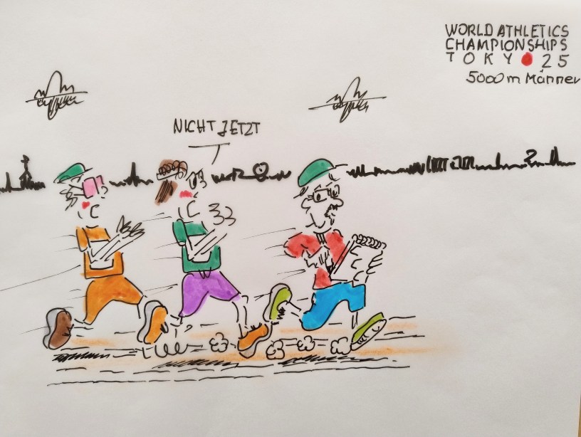 Unser Karikaturist (cartulli) bei der Arbeit: Leichtathletik-WM 2025, Tokio. Samstag, 21. September 2025. Heute: 5.000 Meter Männer. Außerdem: 4×400-Meter-Staffel, Frauen Hochsprung Frauen, 800 Meter Frauen, Diskuswurf Männer, 4×400-Meter-Staffel Männer, 4×100-Meter-Staffel Frauen.