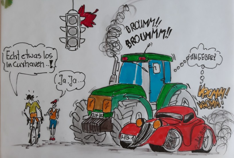 Bin heute früh ausnahmsweise einmal mit dem Auto unterwegs. Weiß gar nicht, warum es so viele Bestrebungen gibt, Tempo 30 in der Stadt einzuführen. Der gemeine Stadtbewohner – Würzburger, Cuxhavener, usw. – scheint doch auch bei freier Strecke nur aller höchstens 40zig zu fahren. Und es ist noch nicht einmal Winter und regnen tut es auch nicht.