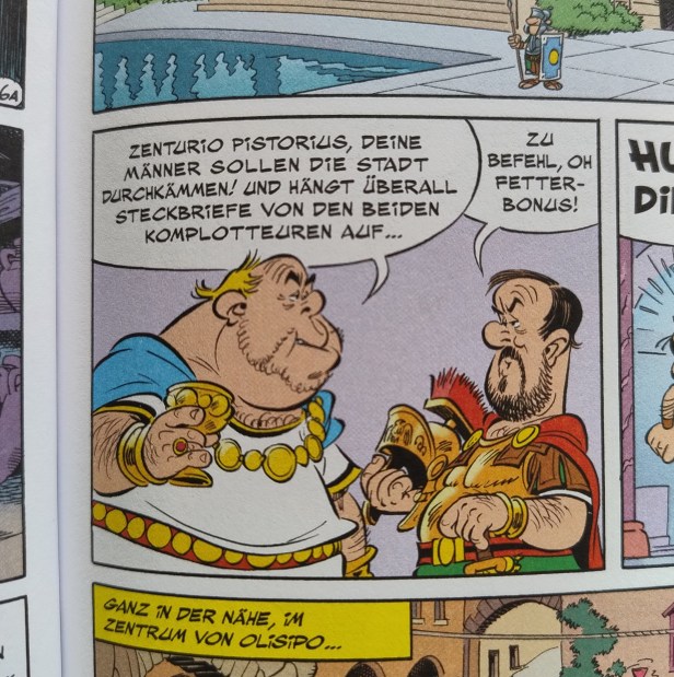 Lustig die Idee der Autoren mit dem portugiesischen Nationalgericht Bacalhau (Stockfisch), einem gesalzenen und getrockneten Kabeljau. Für Obelix ist das selbstverständlich kein Spaß. Denn alles, was kein Wildschwein ist, ist nicht essbar. Angeblich gibt es 365 verschiedenartige Zubereitungsarten für Bacalhau