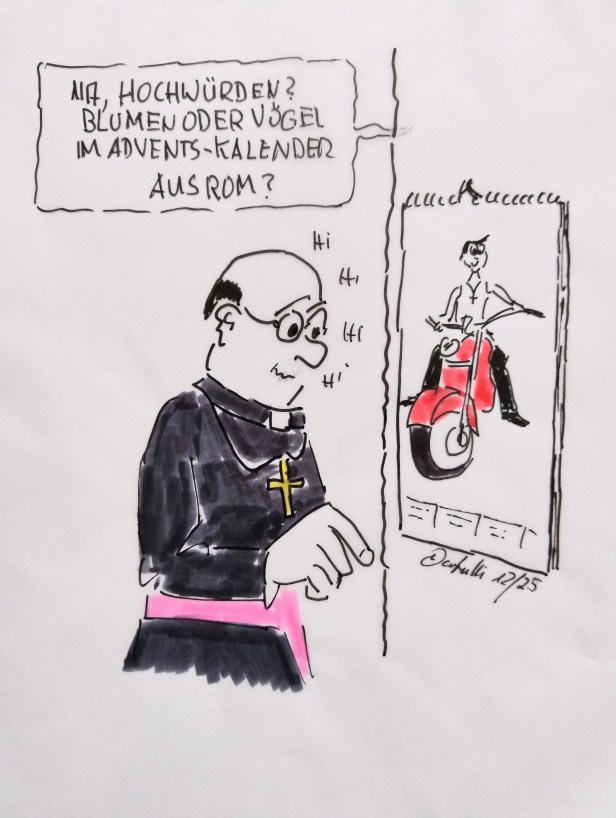 Die Auswahl an Kalendern ist jetzt so groß wie nie. Im Angebot für 2026 sind: zweimal die schwarz gekleideten Priester, der offizielle Leo-Kalender sowie einige weitere aus chinesischer Herstellung, verschiedene mit dem verstorbenen Papst Franziskus, die mit grossem Vorlauf gedruckt wurden, und sogar noch ein Kalender mit Papst Johannes Paul II., der schon seit 2005 tot ist.