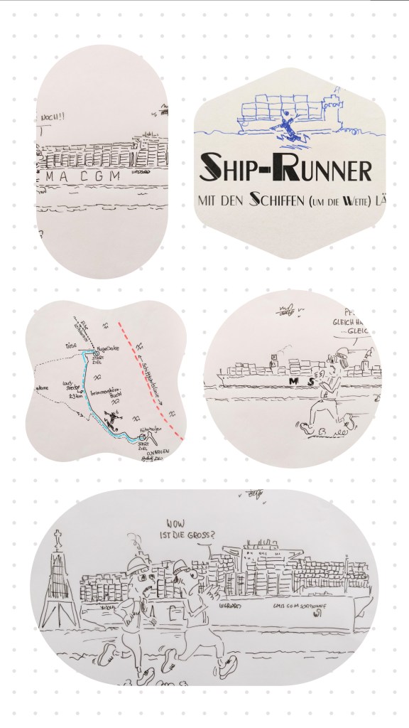 BigShip-Runnung – mit einem Containerriesen um die Wette laufen! Das ist schon eine verrückte Sache, macht aber riesigen Spaß, und geht so halt nur in Cuxhaven – Dicke Pötte gleich neben dem Radweg. Auf unseren Straßen ist alles unter 80.000 PS PillePalle.