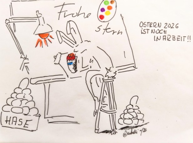 cartulli's Cartoon 29.03.2026 – Jetzt geht es los! Der Osterhase beginnt mit dem Entwurf des diesjährigen Eierdesigns. Datum: 30. März 2026Autor: ullrichhoe 0 Kommentare 29.03.2026 – Jetzt geht es los! Der Osterhase beginnt mit dem Entwurf des diesjährigen Eierdesigns. Teilen mit: Auf X teilen (Wird in neuem Fenster geöffnet) X Auf Facebook teilen (Wird in neuem Fenster geöffnet) Facebook Mehr Auf LinkedIn teilen (Wird in neuem Fenster geöffnet) LinkedIn Gefällt mir Wird geladen …