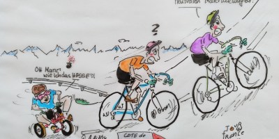 cartulli's Cartoon cartulli’s Tour de France-Cartoon: Die Tour de France 2022 läuft. Dazu gibt es hier „cartulli’s Tour de France-Cartoon“. Schaut regelmäßig rein und lasst euch überraschen. Heute, die 17. Etappe – von Saint-Gaudens nach Peyragudes über 129,7 km. Mit noch nicht einmal 130 Kilometern ist der zweite Tagesabschnitt in den Pyrenäen sehr kurz gehalten. Aber es geht wie im Sprint sehr schnell ans Eingemachte: Nach etwa 50 Kilometern flacherem Terrain, auf denen sich die Favoriten gut einrollen können, geht es in Sachen Berge Schlag auf Schlag. 20. Juli 2022 — Keine Kommentare