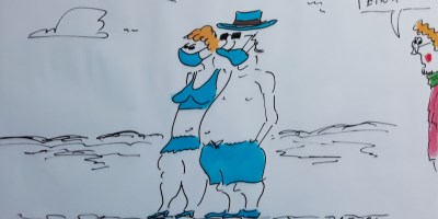 cartulli’s Corona-Cartoon Cuxhaven: Der Trikini setzt sich in der Corona-Badesaison 2020 immer mehr durch. Auch die Herren schließen sich an – der Partner-Look ist wieder da!