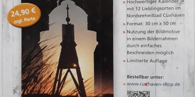Gut zu wissen Cuxhaven-Kalender 2023 – Hochwertiger Kalender mit 12 Lienlingsorten in Cuxhaven – Format: 30 cm x 50 cm – Preis 24,90 Euro zzügl. Porto – Limitierte Auflage – Bestellbar unter: www.cuxhaven-shop.de. 24. November 2022 — Keine Kommentare