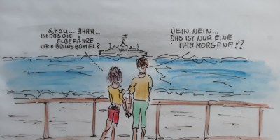 Neuer Cuxhaven-Cartoon: Neues zur Elbefähre – gibt es NICHT! Schau daaaaa, ist das die Elbfähre nach Brunsbüttel? …. Nein, Nein …. das ist nur eine Fata Morgana. Von der Aufnahme eines Fährbetriebs auf der Elbe sind Cuxhaven und Brunsbüttel derzeit weit, weit entfernt – SCHADE.