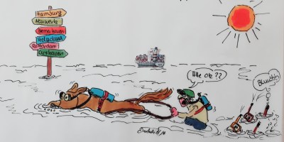 NEUER CUXHAVEN-CARTOON: Von Cuxhaven nach Neuwerk mit der abenteuerlichen Passage des Duhner Lochs. Wer, am Sonntagabend, von Neuwerk kam oder dorthin wollte, dürfte sich dieses Erlebnis etwas beschaulicher vorgestellt haben. Die Fahrt durch das Duhner Loch geriet wegen des erhöhten Wasserstandes zu einem nassen Abenteuer.