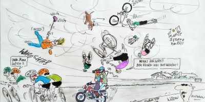 cartulli’s Tour de France-Cartoon – 1. Ruhetag am 10.07.2023: Ein kurzer Blick hinter die Kulissen der Tour de France 2023. Heute, das Thema: Im Tour de France-Peloton – wo man besser nicht fahren sollte.