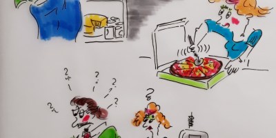 Neuer Cuxhaven-Cartoon: Pizza-Abholservice – Einmal Pizza-Salami zum Mitnehmen, das aber sollte nicht passieren.
